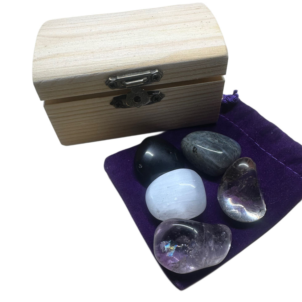 Each set comes in a small treasure chest with a velvet pouch and includes five powerful protection crystals: Obsidian, Smoky Quartz, Amethyst, Labradorite and Selenite. Together they help absorb negativity, cleanse energy and create a protective barrier around your space.